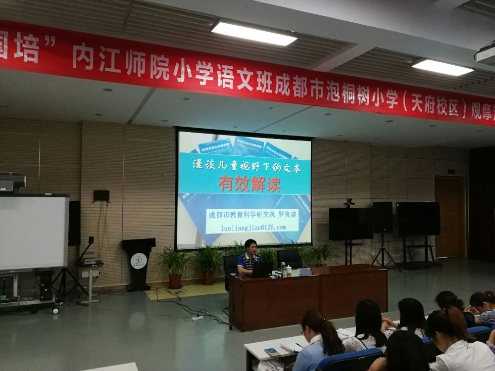 微风送爽,泡桐树小学(天府校区)迎来了“儿童视野下文本有效解读”活动。本次活动由成都市小学语文教研员罗良建主讲,全体泡桐树小学(天府校区)语文老师及内江师范学院国培老师参会。罗老师深入浅出的讲解,让老师受益良多;罗老师风趣幽默的讲解,让老师在笑声里深化了更多的教学理念。本次活动,帮助老师在遵循学生的年龄认知和个性发展的机基础上,从儿童视角进行准确全面的解读文本,以此保护儿童的求知欲,激发儿童的探究欲望。进一步帮助儿童更好地认识周围事物,推动他们的成长。