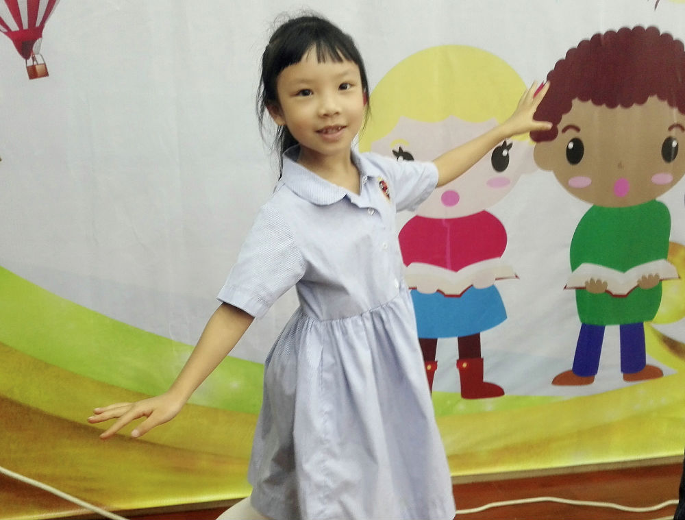 彭娅轩小朋友带来的故事是Going up and down,虽然她的声音未脱童稚,但用非常流利自然的英语为我们讲了一个调皮的故事,只看她在台上边讲边跳,用自己的肢体语言表现着她对这个故事的理解,可爱的模样逗笑了评委和观众们。