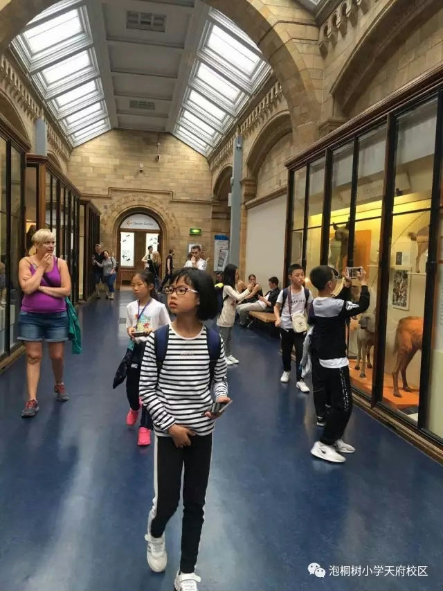 下午三点,孩子们意犹未尽地走出大英博物馆,来到了伦敦自然历史博物馆。英国伦敦自然历史博物馆,位于伦敦市中心的南肯辛顿区,总面积4万多平方米,为欧洲最大的自然历史博物馆,始建于1753年,其藏品标本超过7000万件,尤其是一些已绝迹或濒临绝迹的动物骨架,标本等极其珍贵。孩子们的生物知识非常丰富,迫不及待地走进馆内,诺大的生物骨架、各类珍奇生物标本,像磁铁一样深深地吸引住了孩子们的眼球。他们可以清晰地观察珍惜动物的形与色,也可以通过先进科技设备倾听动物的声音。甚至有的孩子看到兴奋处,竟情不自禁地做起了讲解员。