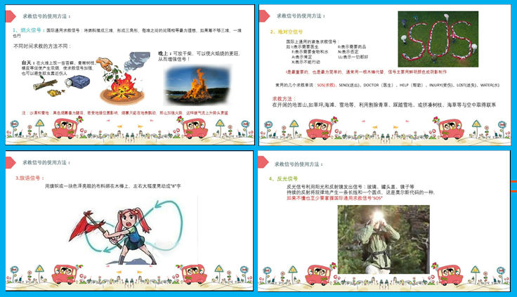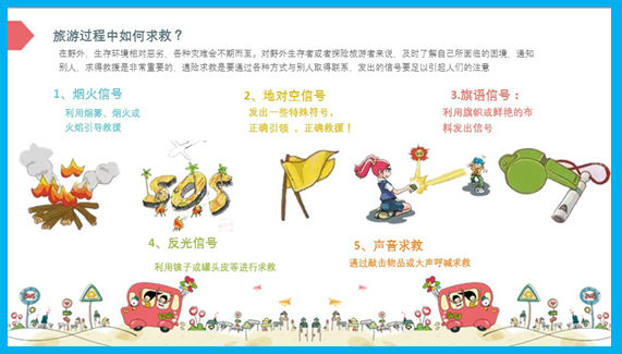 在课堂中,孩子们学会了如何文明旅行:旅行中讲文明礼貌,要爱护文物古迹,尊重旅行当地的习俗等等。孩子还学会了在不同情况下的求救办法:烟火信号,地对空信号,旗语信号,反光信号以及声音求救等。张爸爸详细地介绍了各种方法的具体操作方法,实用而且容易操作。看看孩子们认真记录的笔记,看来真是受益匪浅啊!