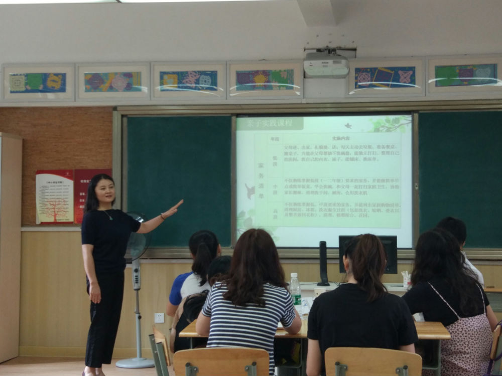 曹娟主任从学校的德育目标出发,指出泡小天府的目标是在全面践行社会主义核心价值观的时代背景和落实“立德树人”的根本教育宗旨下确立的,核心理念是“为每个孩子的最大发展负责。”紧接着,曹娟主任又从“身心健康、人文素养、自主发展、社会责任”四个最关键的方面对德育目标进行了详细的介绍。接下来,曹主任重点介绍了学校德育课程的规划和建设,“学校课程”、“特色课程”和“常规课程”三位一体,共同搭建起德育课程的主体框架。曹娟主任还通过讲述具体课程内容和分享特殊课程案例,如丰富多彩的“家长讲坛”、充满意趣的“家长足球赛”和“亲子实践课程”等等,让大家深切感知了德育课程建设的魅力所在……