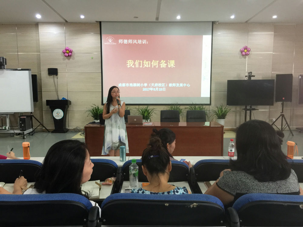 初秋的八月,虽然没有七月那么酷热,却依然闷热。但这一切都不能抵挡泡天人相隔两月再相聚的激情。2017年8月23日上午,成都市泡桐树小学(天府校区)多功能厅充满欢声笑语,全体老师欢聚一堂,携手迎接新学年。老师们一见面便热火朝天地聊起来,你一言我一语,似乎与久别的兄弟姐妹再相见,其乐融融的场面让人不得不感叹:真是相亲相爱的一家人!