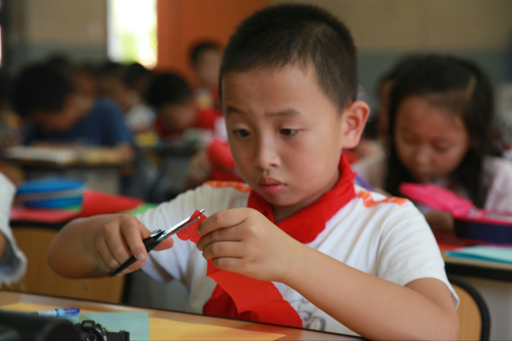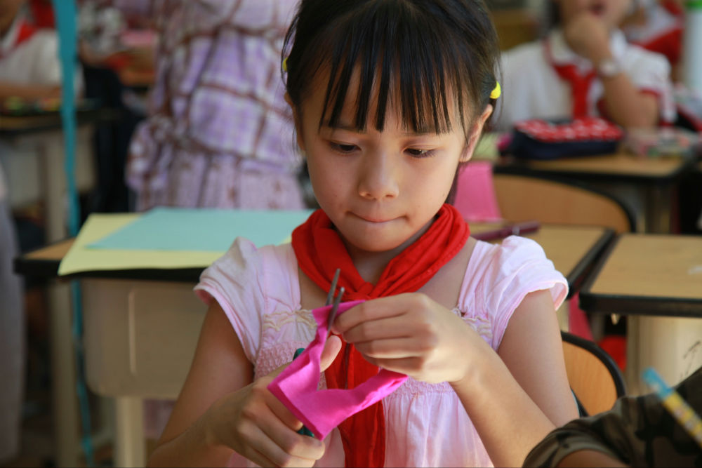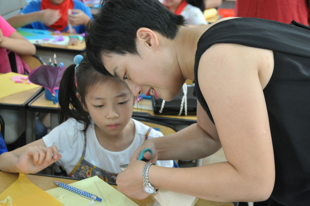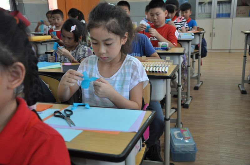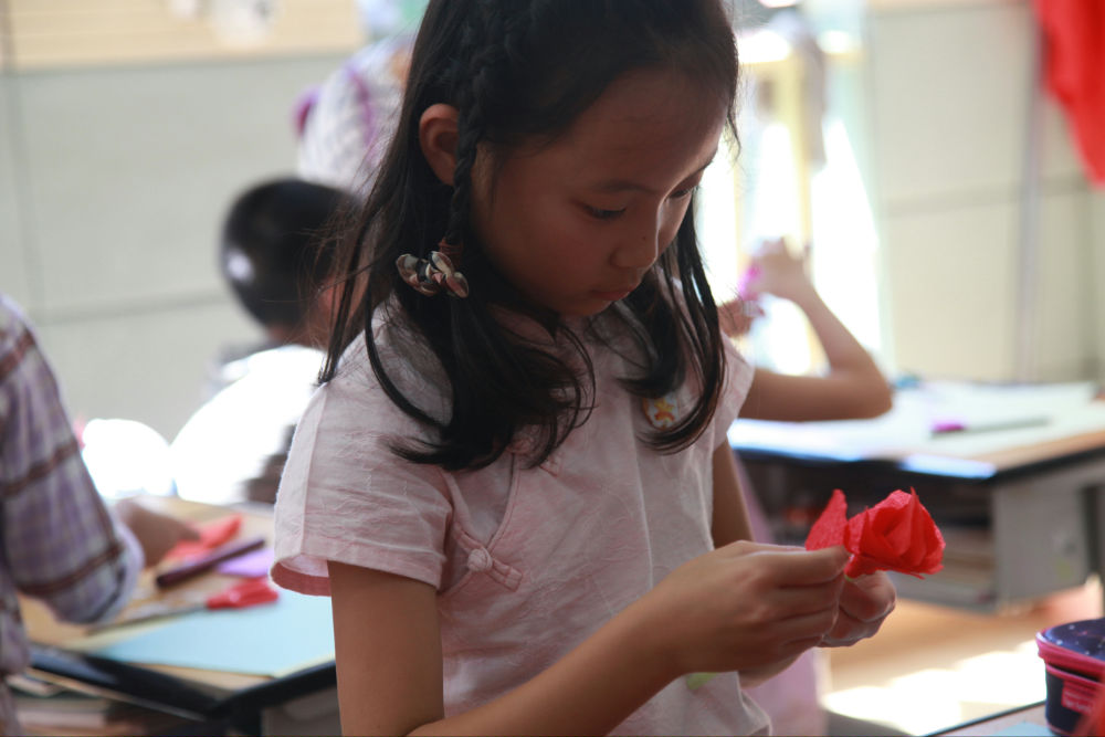 “老师,我做的这个好看吗?”“老师,我折好了!看,这是朵蓝色的花,漂亮吧!”“哎呀老师,这个我怎么也剪不好”……活跃又欢乐的气氛,是泡桐树小学(天府校区)四.七班家长课程的热闹情景。
