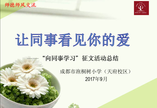 为大力弘扬爱岗敬业、乐于奉献、享受职业的人生品质,建立一支师德高业务精的教师队伍,决定在向全校范围内开展 “向同事学习”征文评选活动。2017年9月18日下午,学校教师发展中心以“让同事看见你的爱”为主题,对9月开展的“向同事学习”征文活动做了一场诗意的总结。