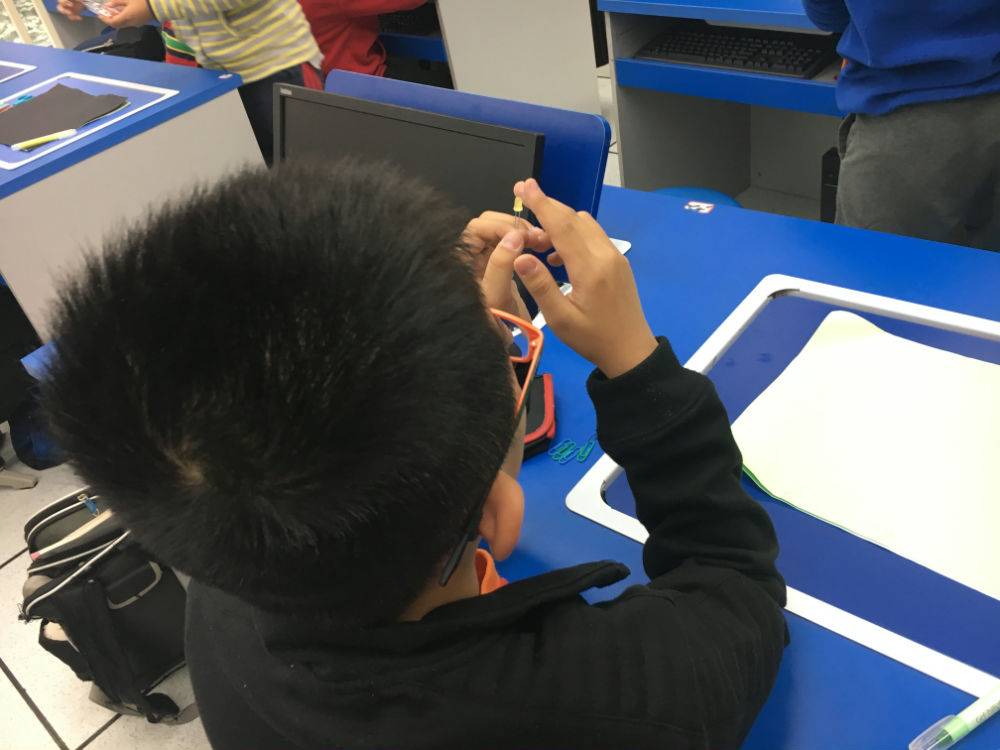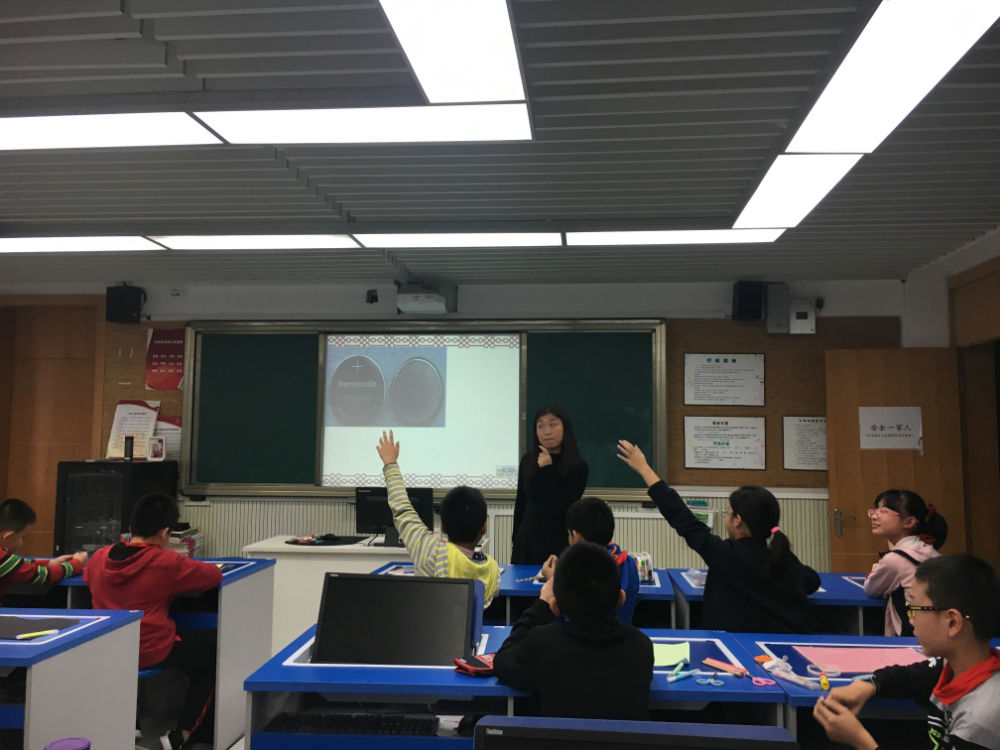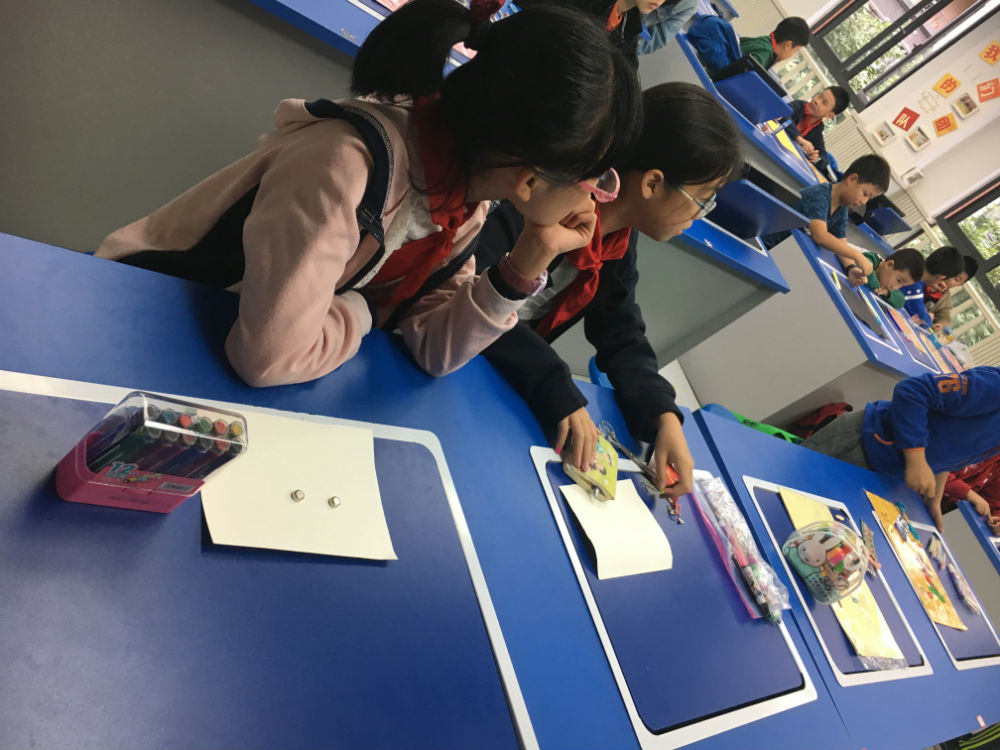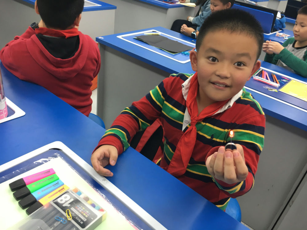 那么,今天的科创活动中,姚老师会带给五年级的小泡泡什么样的新奇体验呢?对于贺卡,你希望它有哪些与众不同的地方?我想我的贺卡一打开,贺卡上的东西就可以投影出来,我想我的贺卡可以说话。那么一张发光贺卡,你想创造吗?小泡泡们温习了一下,如何点亮小灯泡的知识,拿出自己的纽扣电池和卡纸,姚老师给大家介绍了两个做贺卡所必须的新朋友——铜箔胶带、二极管。铜箔胶带就像四年级做实验用到过的导线,小泡泡们并不不陌生,而发光二极管他们之前并没有点亮过,它与上课用过的小灯泡不一样,正负极固定,必须对应接在电源的正负极上。认识了材料,小泡泡们就开始分工合作,2人一组动手制手工贺卡。设计—绘图—制作—改进,每一步都需要认真、细心!