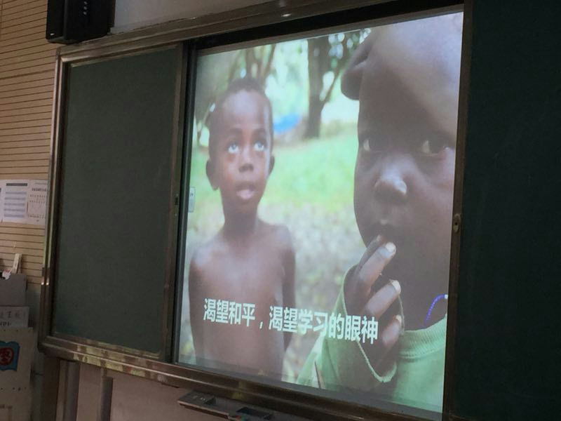 投影画面里,一个皮包骨的婴儿,坐在破烂脏黑的盆子里,空洞无助的眼神被镜头放大着悲哀和绝望;一个衣不覆体、骨瘦如柴的男孩儿,正无力伸手,想拔枯草充饥,背后却兀立着惊悚的秃鹫;一群身形奇怪的孩子们,头大、身小,鼓鼓的肚腹是寄生虫繁衍的乐园……酷热的天气,极度的贫困,战乱的动荡,刘叔叔在讲述中几度哽咽,孩子们也不时的感叹“他们好可怜啊……” 刘叔叔对孩子们讲到,中国从2000年开始维和行动,目前已向八个国家派遣了1700余名维和警察。参于非洲维和行动,不仅是我国大国形象、影响力的职责所在,更是维护世界和平的积极实践,同时,还如《战狼2》所示,对中国侨民来说,维和部队和中国远洋舰队是同胞们身处险境时最有力的保护者。孩子们听到这里都禁不住热血沸腾,对比非洲儿童的遭遇,更心生对祖国强大的自豪和感恩。
