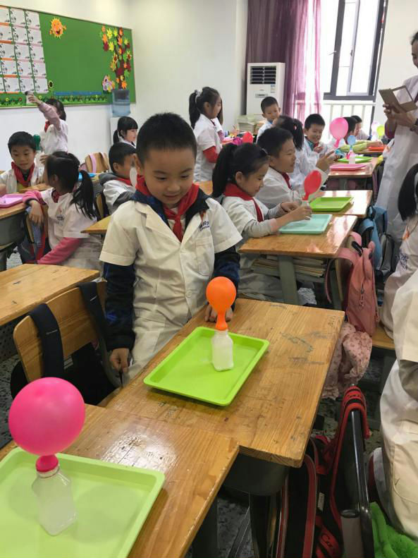 哇,气球鼓起来了,同学们兴奋不已。那个神秘的巫师原来是小苏打和白醋反应生成的二氧化碳气体!