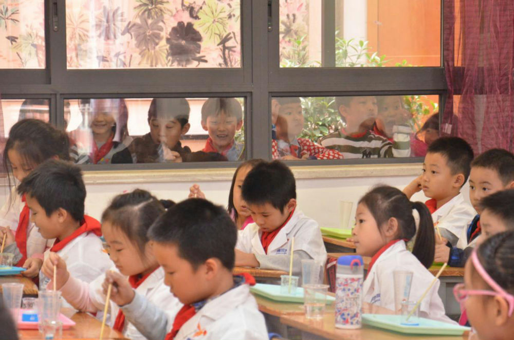 科学实验的魔法深深吸引着隔壁班的同学,趴在窗口驻足观看,真羡慕十二班的同学啊!