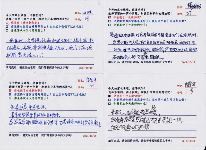 “幸福不是你拥有什么,而是感恩你所拥有的”。如今的孩子们,都理所应当地享受着父母对自己的宠爱和优越的生活,反而却经受不住一点点的不如意或小挫折。但当孩子们看见还有一些人仅仅为了每天能喝上一口水,就得在外走一天;有些孩子早早失去父母,不仅要照顾自己,还得照顾弟弟妹妹担起家庭的重担;我们平时吃剩下的炸鸡也会是很多孩子奢望的美味佳肴;而现在每六秒钟都会有一个儿童因为饥饿而死亡……看着这些直击心灵的影像资料,孩子们沉默了、落泪了、一双双纯净的眼睛若有所思着……相信他们今后会更加懂得珍惜,逐渐学会感恩自己所拥有的一切,从而获取在平凡又漫长的岁月里也总能感知到幸福的能力。