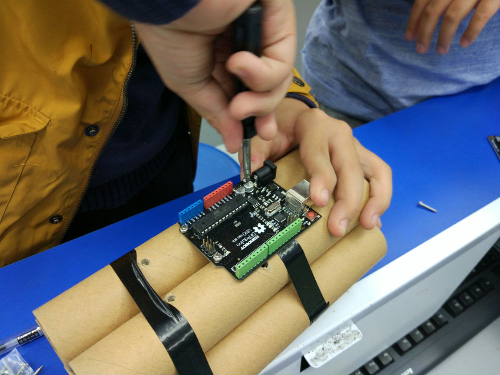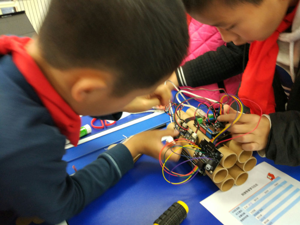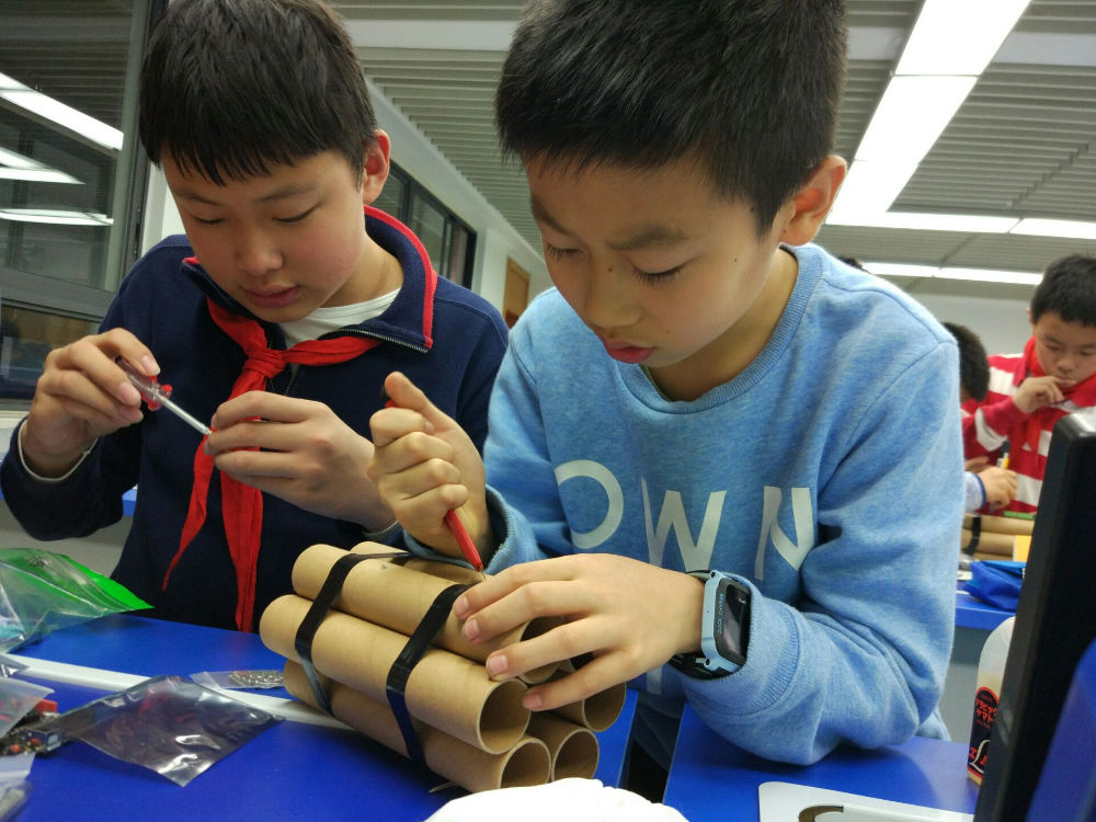 第二步,孩子们正式开始了和炸弹的正面接触。要想拆解炸弹,首先要制作炸弹。尽可能全方位地了解它的结构原理,才能进一步拆除它!孩子们撸起袖子就开始干,捆炸药包,上控制板,制作撞针,一步一步,有模有样。但是这个过程也是孩子们遇到困难最多的环节,螺丝拧不好啊,线理不清啊,还好陈老师先一步的分工解决了这个问题。孩子们在制作过程中,相互磨合,终于找到了最适合的合作方式,制作进度也快了起来。