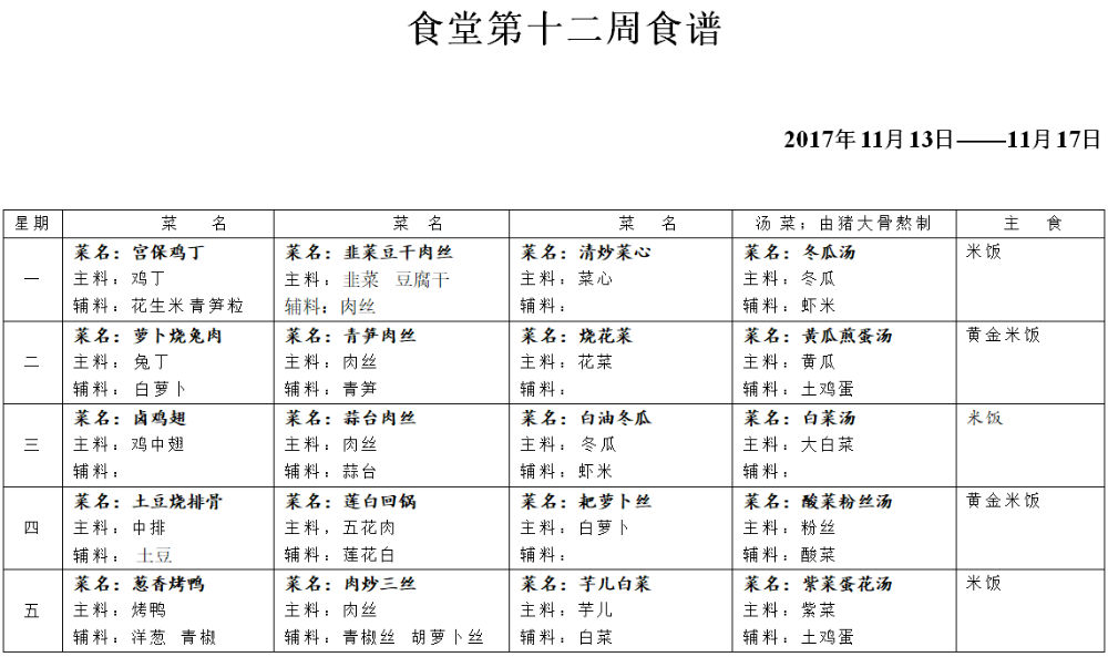 17—18学年度上期第十二周午餐菜谱