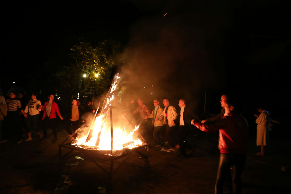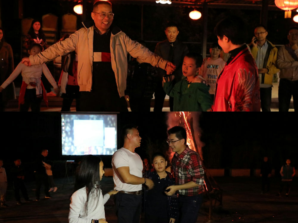 晚饭后,广场上燃起的篝火也点燃了大小泡泡们的激情,大家拉手围成圈,在可爱的《兔子舞》音乐中欢快跳跃,拉开了篝火晚会的序幕。