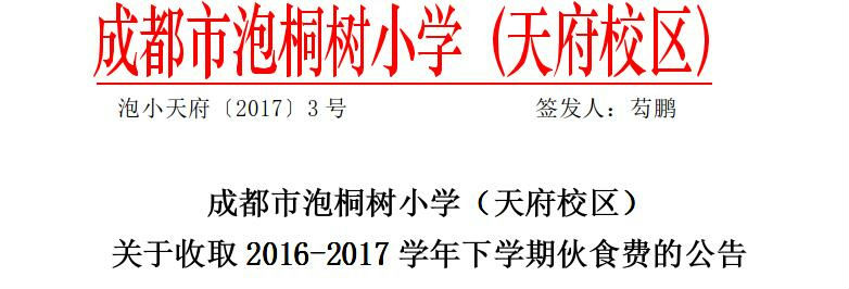 根据成都高新技术产业开发区社会事业局及财政局相关财务制度规定,我校2016-2017学年度下学期收取学生及教师每月伙食费如下: