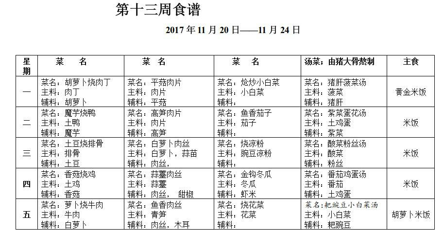 请各位家长查看第十三周午餐菜谱,若您的孩子对某样食材过敏,请一定要提前告知班主任老师哟,谢谢~