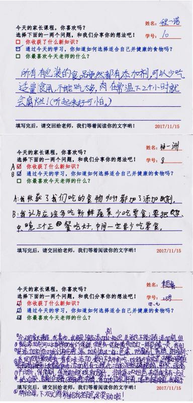 课堂通过互动提问、图文讲解、视频播放等方式进行,一张张孩子们熟悉的食品图片,一幅幅孩子们熟悉的场景画面,深入浅出的讲解,风趣幽默的比喻,课堂氛围十分热烈。“叔叔,我还有个问题?”“叔叔,我知道食品添加剂是什么了!”在一个多小时的课堂里,孩子们时而凝神贯注,时而捧腹大笑,一个个兴致盎然、受益匪浅。张悦微小朋友说“通过程叔叔精彩讲授,我知道了以后要尽量少吃零食,少喝饮料,多喝白开水,养成健康饮食习惯”;黄雅懿小朋友说“通过程叔叔精彩讲授,我知道了以后一定不能去没有食品许可证的地方吃饭了”;郑楚凡小朋友激动地说“听了程叔叔的讲解,我知道了以后尽量在学校和家里把饭吃好,不去不卫生的地方吃东西”。最后,殷铭老师对食品安全课程进行了总结,让孩子们重温了程叔叔的三点倡议,让食品安全意识深深的印入了孩子们的脑海里。