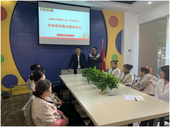 为进一步做好学校疾病防控工作,10月10日下午,我校召开了消毒杀菌培训会,会议邀请了消毒公司专业人员为我校物业人员、校医进行了现场培训。
