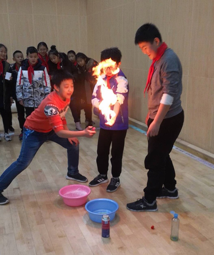 你看,3号场地腾起了一片火焰,煞是好看,原来是5班的同学正在展示小实验——手捧火焰;8班同学穿着戏服,随着手上动作的变化,脸上的面具也在变化,好一个神奇的变脸;摇曳的身姿、婀娜的舞步,2班同学正在上演《笛中花》。