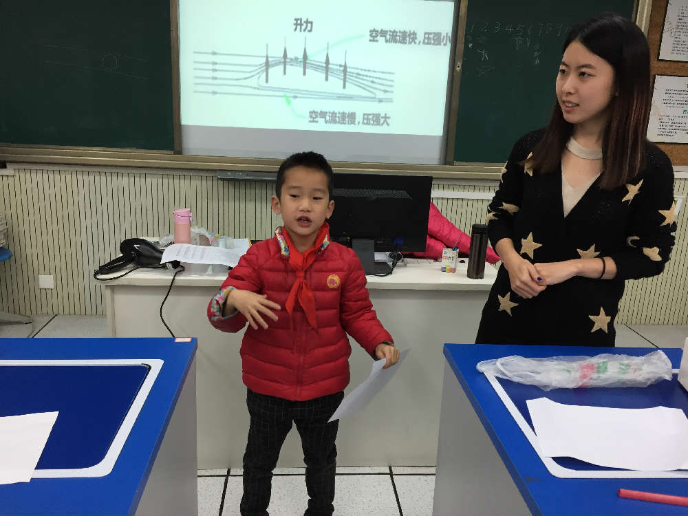 学生们开始思考原因,进而引出这节课的主题“伯努利原理”,刘老师为了方便孩子们的理解,把空气宝宝搬出来了,空气宝宝的能量是一定的,如果手上的能量豆多,那脚上的就比较少,这样就造成了压力大,