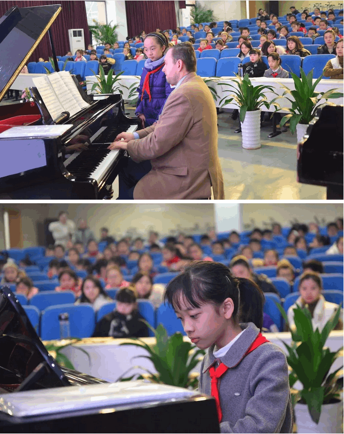 三.1班兰一、六.2班李云奕同学和音乐组欧阳蓝兰老师为大家演奏了钢琴曲,格里高利.金达老师分别为她们的演奏进行了现场点评和指导。
