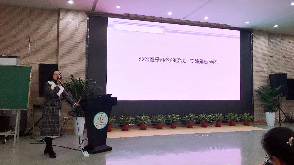 接着是第二组镜头:老师的办公室非常安静,门上张贴着禁声的标语;一间开放的办公室里,两位老师在安静办公。由此说到我们的办公室文化,说到我们提倡的安静文化。教育区域是开放的,我们不需要别人监督你,我们做好学生的榜样,言传身教,在整洁的办公室里安静的办公。这组镜头的深意正如宋校长所说——办公的区域,安静是必须的。
