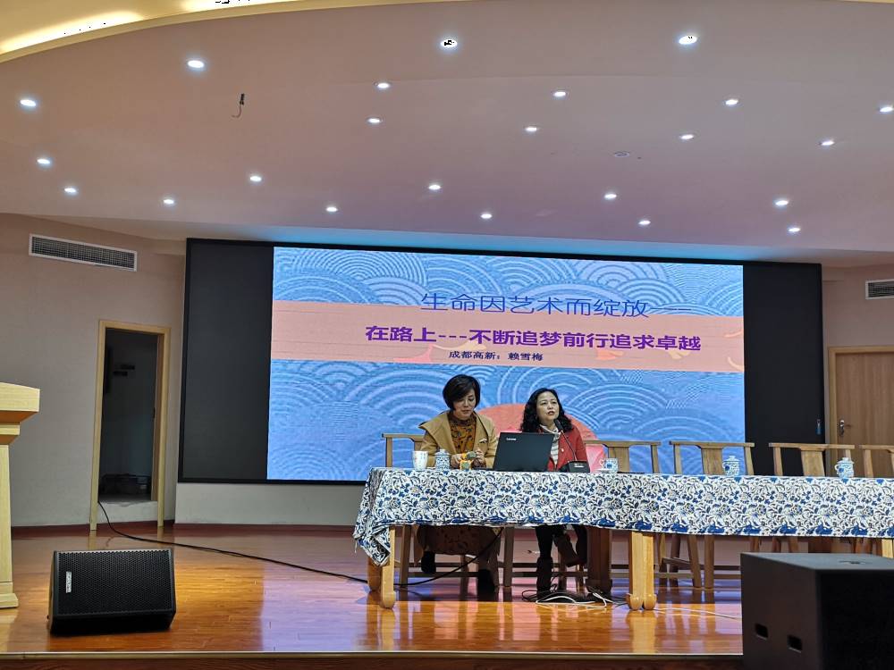 本次培训,由成都市教育专家、成都市美术教研员辜敏老师主持,成都市美术学科带头人、高新区美术教研员赖雪梅老师主讲,我校美术组没骨画课题组全员参与,培训内容包含:高新区没骨画师生作品展示,没骨画技能技法培训讲座、没骨画实践。
