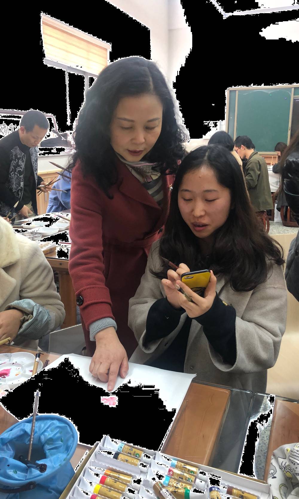 接下来是创作指导,赖雪梅老师让参加培训的200多名中小学美术教师根据自己的兴趣自由选择,可以分别到5间教室(人物、动物、花鸟1、花鸟2、蔬果教室)进行创作体验,踊跃体验没骨画。体验过程中,我校美术组老师积极参与其中,虚心请教,认真学习,与辜敏老师近距离的交流,接受悉心指点。赖雪梅老师耐心为大家讲解示范。我校美术组的课题组老师们和大家共同探讨、示范、交流。在两个多小时的现场实操过程中,老师们对没骨画有了更深入的认识,作品的独特效果让老师们感受到中国没骨画的魅力,创作的喜悦溢于言表。更加有信心将没骨画实践于我校平时的课堂当中