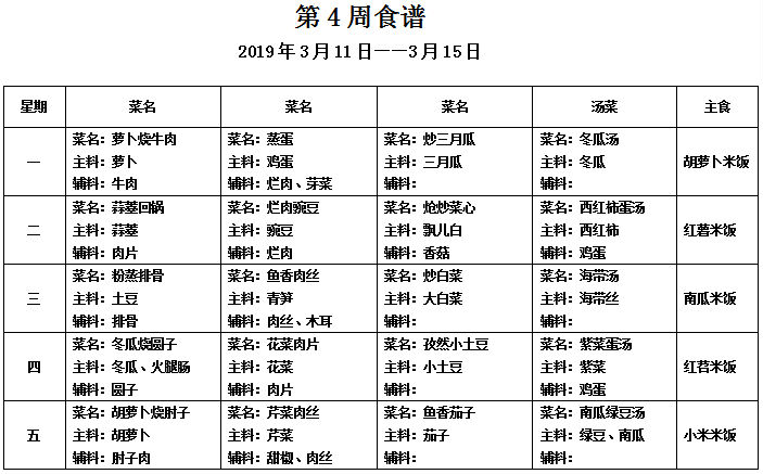 请各位家长查看第四周午餐菜谱,若您的孩子对某样食材过敏,请一定要提前告知班主任老师哟,谢谢!