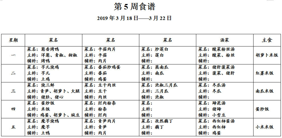 请各位家长查看第五周午餐菜谱,若您的孩子对某样食材过敏,请一定要提前告知班主任老师哟,谢谢~