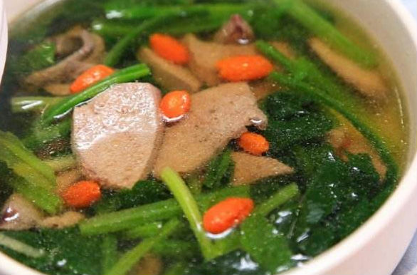 猪肝味甘、苦,性温,归肝经; 有补肝、明目、养血的功效。