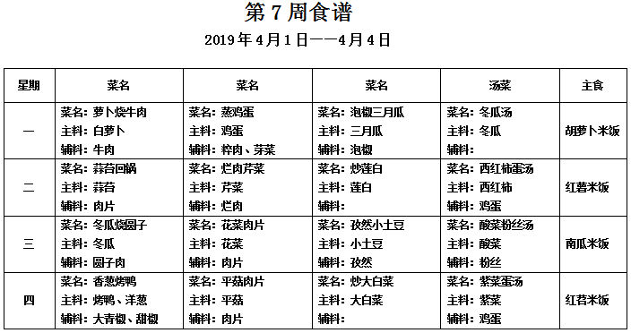 18—19学年度下期第七周午餐菜谱(4.1~4.4)