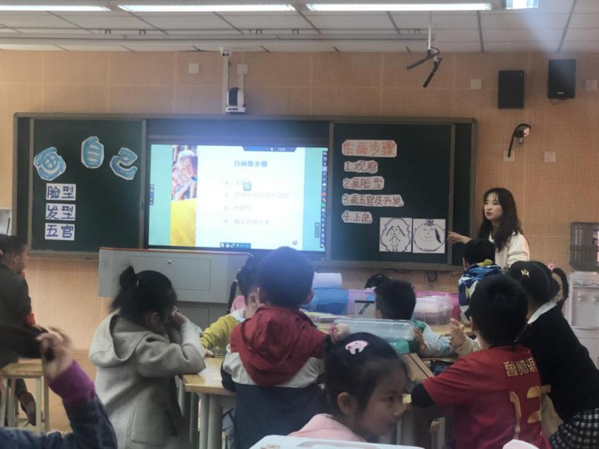 魏嘉莉老师执教的《画自己》通过画自己这样的示范导入,让孩子们更加感受到了课堂的美术运用,孩子们也非常热情的在猜测老师画的是谁,引出课题画自己。整个课堂中运用了情景教学,让孩子的参与度非常的高,并且在创作中,孩子们也是充满好奇,通过镜子仔细的观察自己,然后进行创作。