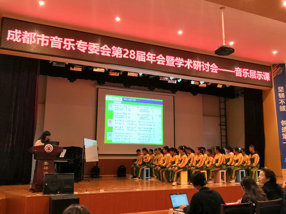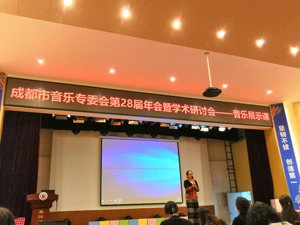 一、教学现场课例展示,分别是:成都市 20 中 李冬颖 示范执教唱歌综合课《让世界充满爱》。该教师作为本届四川中学组参加全国赛课的代表,为大家展示了中学组以单元主题式的教学引导学生体会不同民族、不同风格的表达大爱精神的歌曲,从音乐要素进行分析,引导学生能进行比较准确的表现。第二节是成华区的区课题,以及音乐学科子课题,戏剧与音乐学科的融合课《明天会更好》 成都市建设路小教育王珲 老师带领学生结合08地震灾区的情景体验,进行音乐素养体验,歌曲情绪、情景体验,给参会教师很好的启发,发现了戏剧教育对学生综合素质提升的魅力,回校后余世凤老师也进行了大胆尝试。