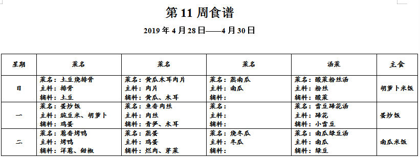 请各位家长查看第十一周午餐菜谱,若您的孩子对某样食材过敏,请一定要提前告知班主任老师哟,谢谢!
