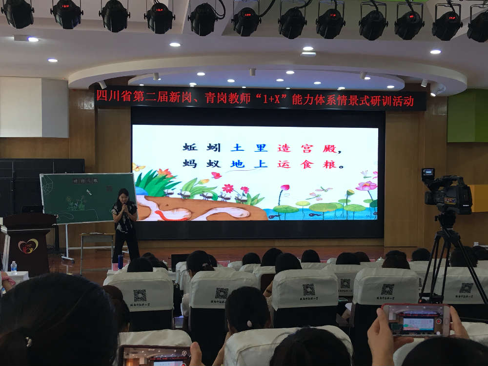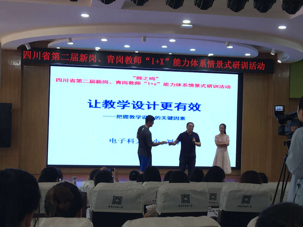 下午,四川省优秀教师、小学语文骨干教师刘学平老师开讲“让教学设计更有效——把握教学设计的关键因素”,以影视剧的拍摄为例,一步步引导新岗、青岗教师“设计出一个对学生有益的教学活动”。