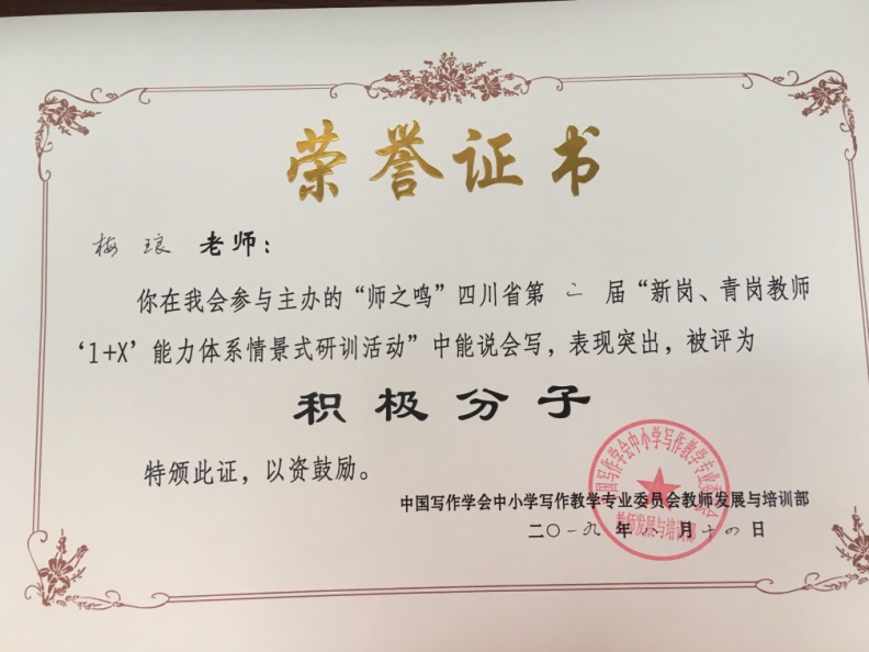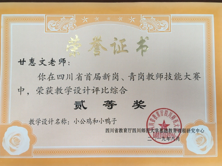 最后,还进行了隆重的颁奖礼。我校教师甘慧文获得教师技能大赛教学设计评比二等奖,梅琅老师获新岗、青岗教师研训活动“积极分子”奖。