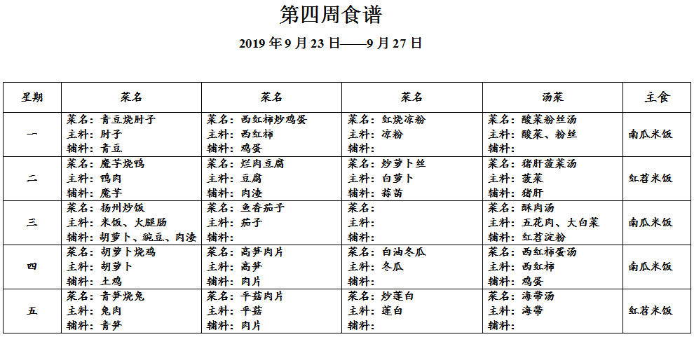 请各位家长查看第四周午餐菜谱,若您的孩子对某样食材过敏,请一定要提前告知班主任老师哟,谢谢!