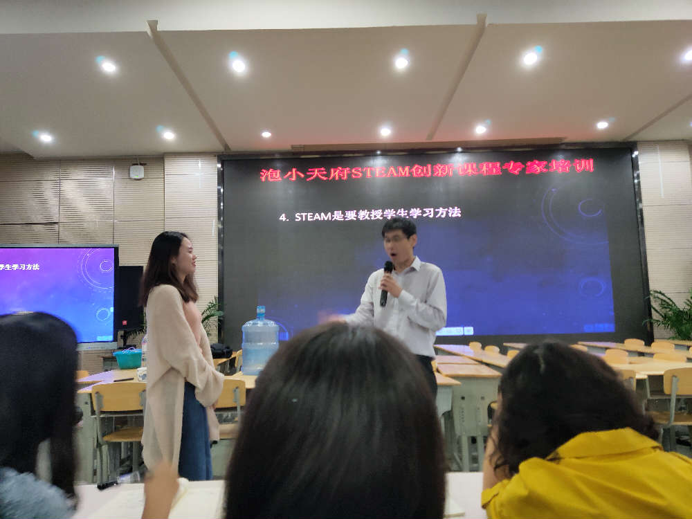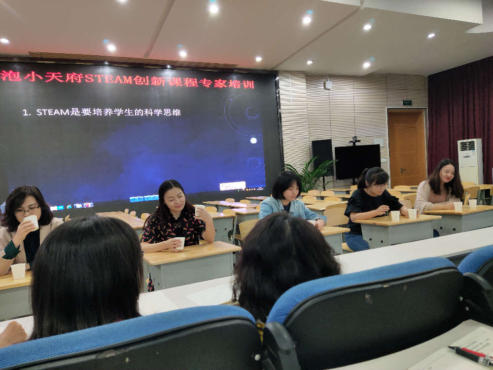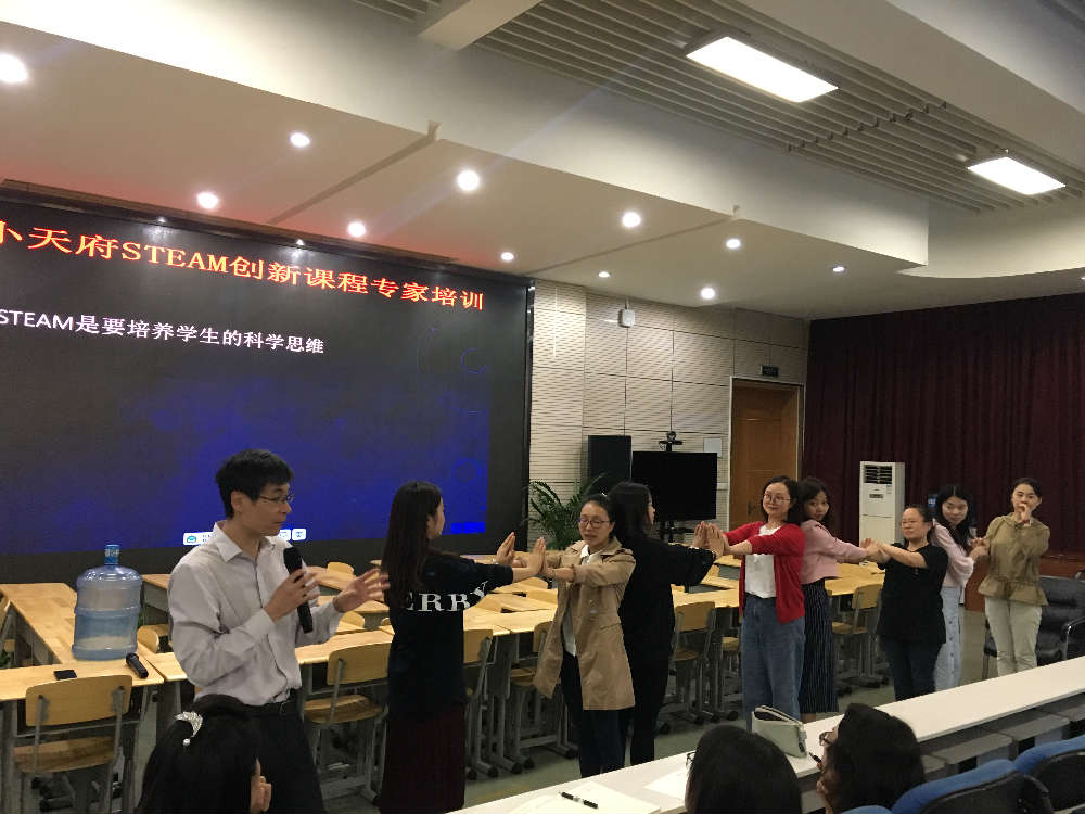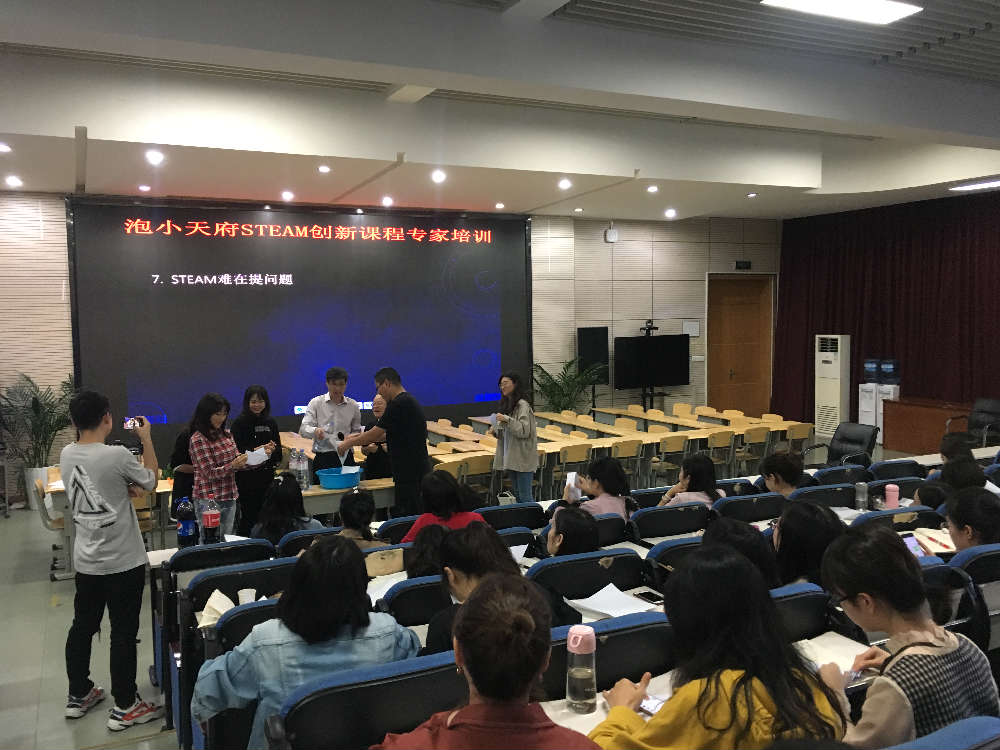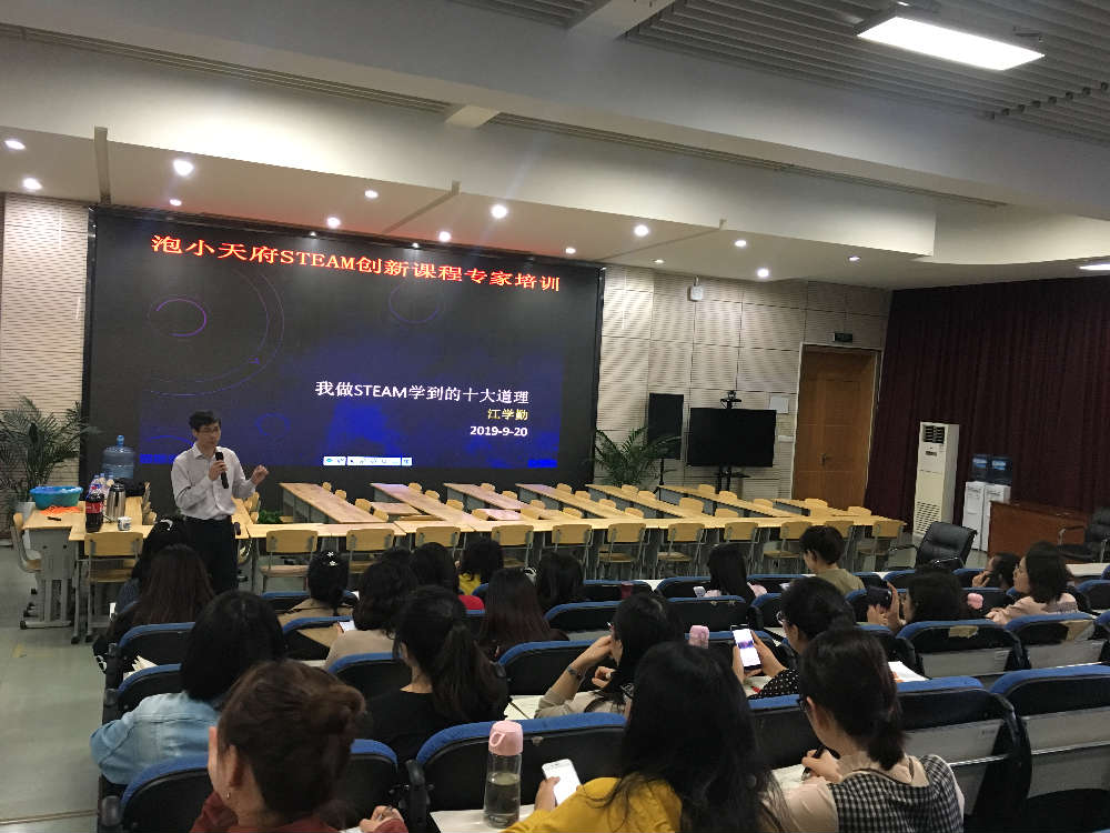 2019年9月20日,“泡小天府STEAM创新课程专家培训会”在多功能厅举行,本次培训会邀请了哈佛大学教育研究院的研究院、《课堂内外》顾问、成都市陶行知研究会专家江学勤老师,江老师通过各种有趣的游戏和视频为我们传达了他做STEAM研究的十大道理,让老师们在一种非常轻松地教学环境中感受到了STEAM的魅力。本次师资培训采用学科理论教学、主题讲座、交流研讨、参与式活动、示范教学课等多种方式,从STEAM教育课程理念、课程设计、课程实践和课程评价等维度进行了全面解读。通过此次培训解决了开展STEAM教育教学实践中的一些实际问题,提升了教师STEAM教学能力,培养了教师的创新思维和专业素养。
