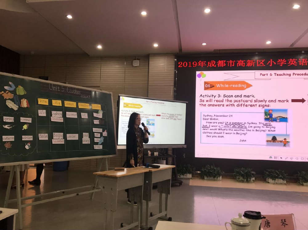 在10月24日的全区课例展示中,王思雨老师以明信片为载体,引起学生的阅读兴趣,启发学生思考,学会介绍不同城市的气候状况和穿衣建议,了解了北半球的中国和南半球的澳大利亚两个国家的气候反差,培养了文化意识。最终,凭借精湛的专业素养和富有逻辑性的教学设计,荣获第二名的好成绩,并将代表全区参加成都市的决赛。在本次比赛的筹备以及磨课中,全体英语组从未停下前进的脚步,始终潜心教学,静待花开,坚信思考的力量是进步的源泉。