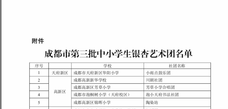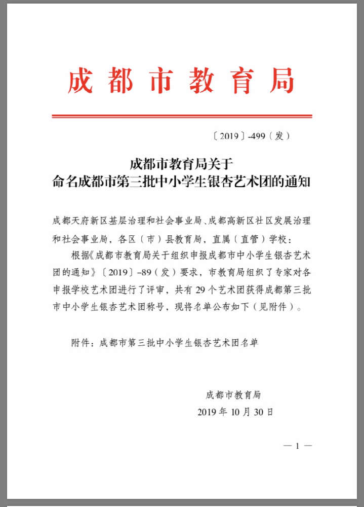 “中小学生银杏艺术团”是成都市教育局于1995年成立的,有着二十多年的历史,代表成都市中小学艺术教育最高水准,每年深入成都市中小学举办巡演活动,以此推动艺术教育的发展,培养高水平的艺术人才和队伍。