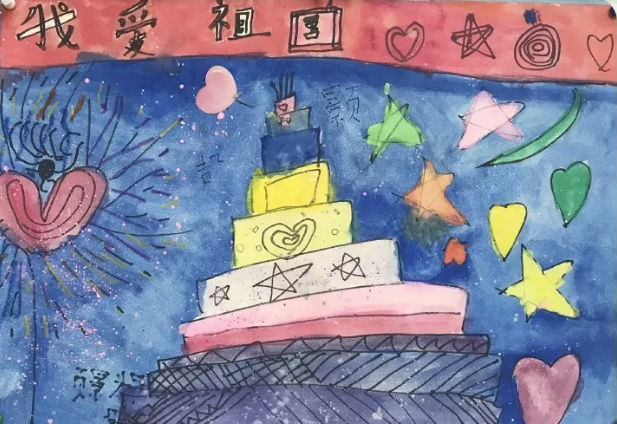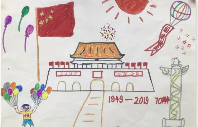 有的班级通过开展《我和我的祖国》主题画展的形式向祖国表白。天安门、五星红旗、万里长城、巨型生日蛋糕、和平鸽、华表……这些形象不断地出现在孩子们的画作中。每一幅画中,我们都能感受到,祖国妈妈已经深深的住进了泡泡们的心里。