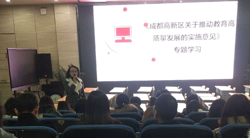 为坚持优先发展教育事业,大力弘扬“创字当头、惟高惟新、以质为炬、争先率先”的高新精神,践行高新工作价值观,着力解决人民日益增长的美好生活需要和教育发展不平衡不充分的矛盾,努力办好人民满意的教育,为高新区建设国家高质量发展示范区和世界一流高科技园区提供人才支持和智力支撑。成都市泡桐树小学(天府校区)全体教师于2019年12月2日下午在阶梯教室参加了专题学习《成都高新区关于推动教育高质量发展的实施意见》。此次专题学习,学校高度重视,宋茜校长主持,分管行政解读。