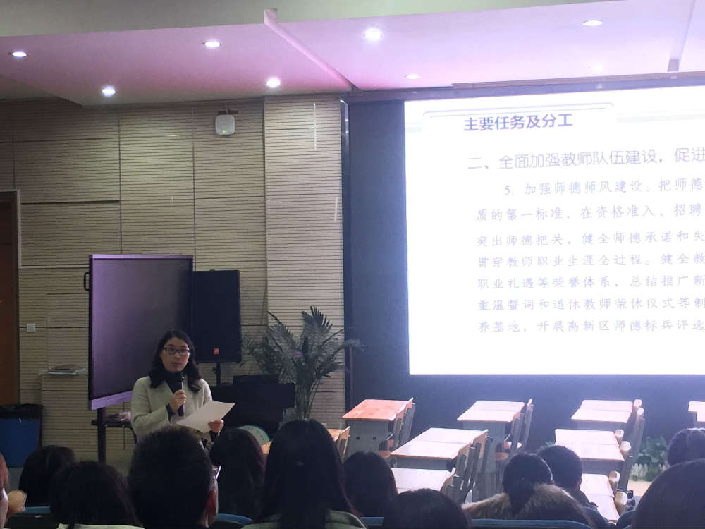全面加强教师队伍建设,促进教师专业成长。教师发展中心欧小丽主任解读了如何加强师德师风建设;如何优化教育管理人才培养;如何提升教师专业素养。宋茜校长解读了如何推动基础教育优质发展;如何推动特色教育优质引领发展;如何推进学校办学模式改革;如何强化教育综合质量评价,从而强化目标考核评价,营造良好氛围环境,建设平安和谐校园。