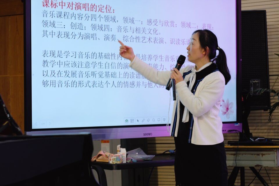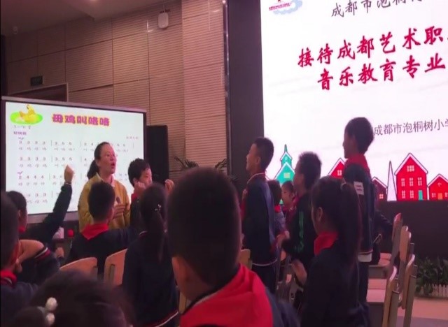 第二部分:由我校音乐组教师万里燕带来讲座《小学唱歌教学的有效策略》在讲座中我校教师刘馨媛、邓淑月、方堪、干波、江樾分别将自己的经典课例进行了微课展示,整个展示活动中老师们与同学们互动性、实效性强,成都市职业艺术大学大二的同学们无不为我们音乐组老师们的个人专业修养、教学技能所感染。