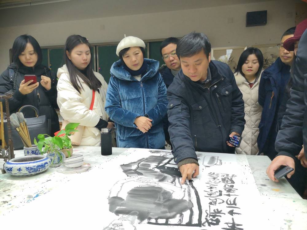 随后大家参观陈冠夫名师工作室,欣赏陈冠夫副校长的国画作品,大家对陈冠夫副校长的国画作品赞不绝口,称赞其神韵俱佳,画风独特。
