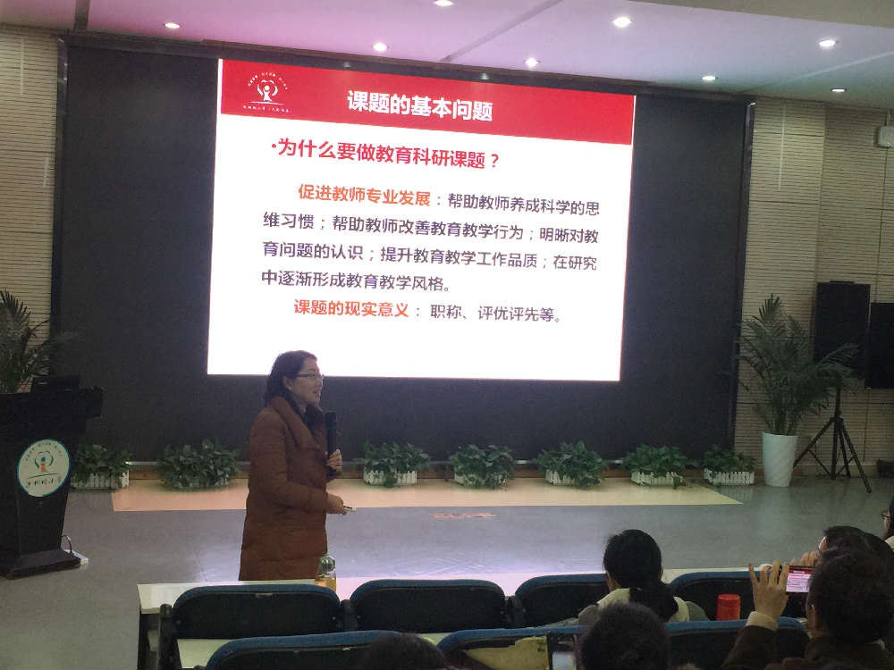 然后,教师发展中心游琼英主任给大家做教育科研课题培训,讲解如何做好教育科研课题的选题工作,重点阐述了选题工作中要遵循的价值性、科学性、创新性、具体性和可行性原则。游主任从各学科的多个案例出发,详细讲解课题表述的技巧与方法,教会如何凝练一个好的研究题目。教师们认真学习,反思科研工作中的不足,分享培训中的点滴收获。