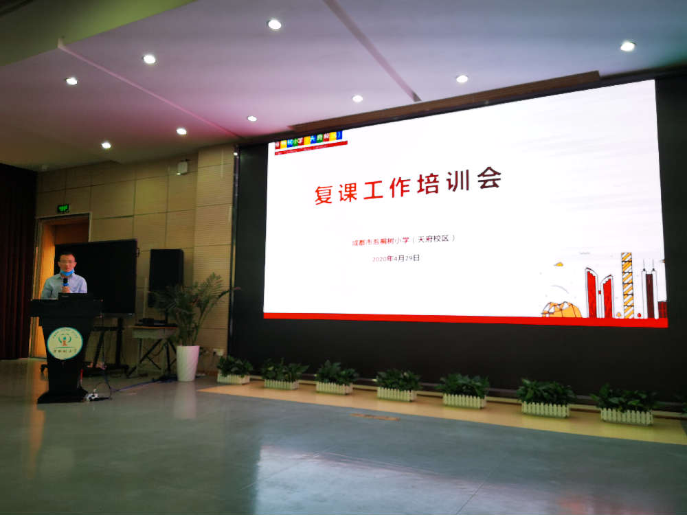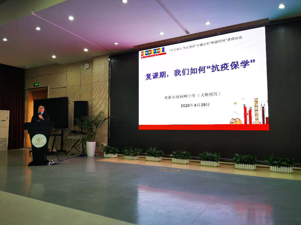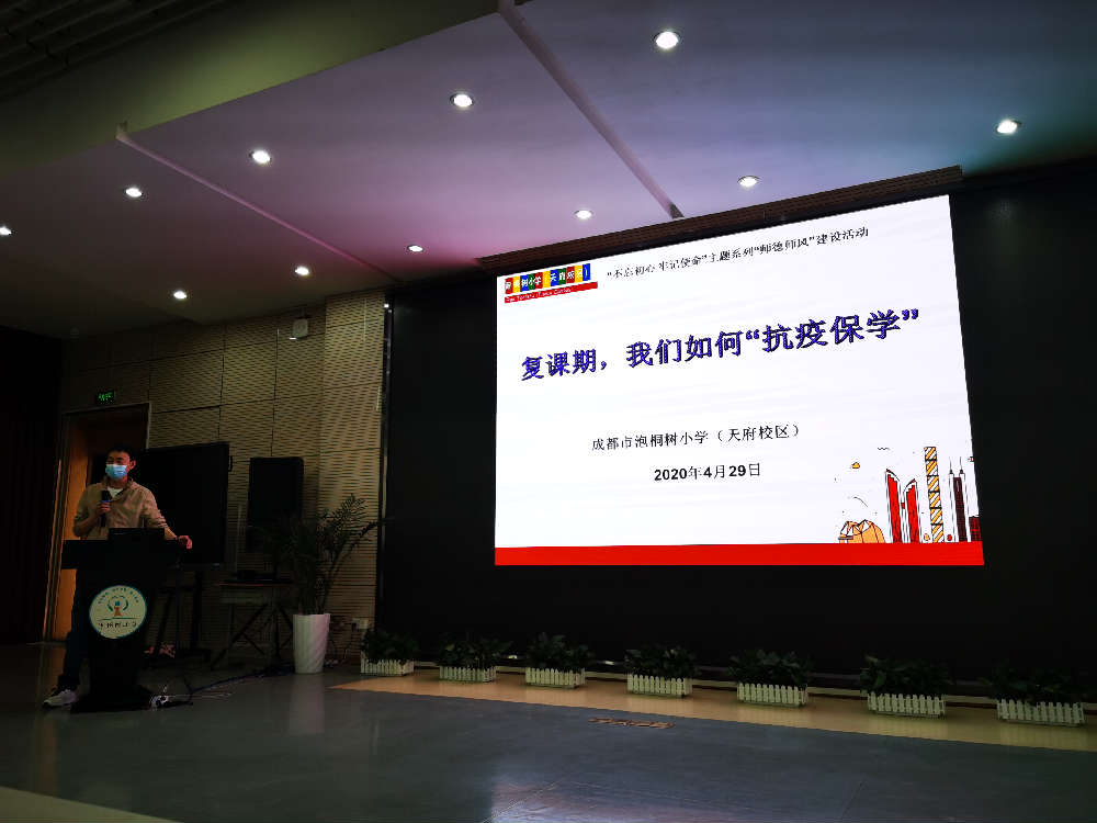 春路雨添花,花动一山春色。春暖已至,花开可期。“超长版”的假期终于迎来了尾声,孩子们即将回到美丽的校园,静谧了两个多月的校园又将恢复往日的热闹。为了做好“抗疫保学”,将病毒抵制校园外,更好地保障孩子们和老师们的安全,2020年4月29日上午9点泡桐树小学(天府校区)宋茜校长组织全校教职工参加了本次培训会,会议主题是【不忘初心·牢记使命】——复课期,我们如何抗疫保学。