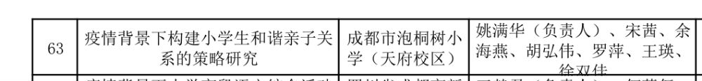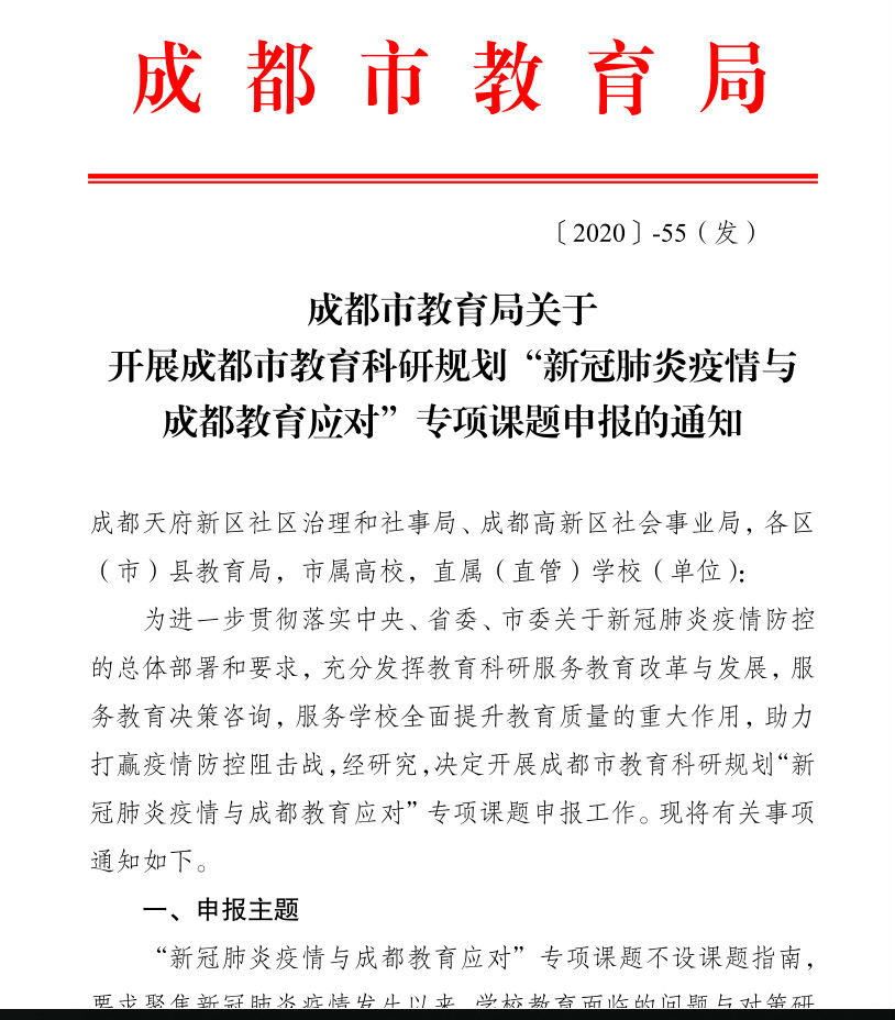 据此,结合成都市教育局关于开展“新冠肺炎疫情与成都教育应对”专项课题的申报要求及精神,课题组成员通力合作,填写了《疫情背景下构建小学生和谐亲子关系的策略研究》的立项申报书,并于2020年4月22日获得成功立项。
