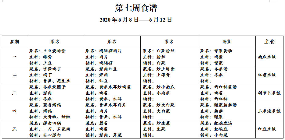 请各位家长查看第七周午餐菜谱,若您的孩子对某样食材过敏,请一定要提前告知班主任老师哟,谢谢!