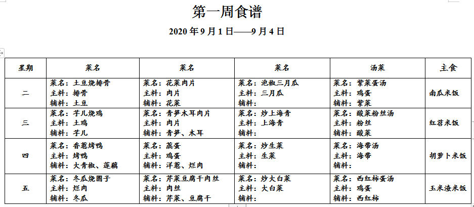 请各位家长查看第一周午餐菜谱,若您的孩子对某样食材过敏,请一定要提前告知班主任老师哟,谢谢!