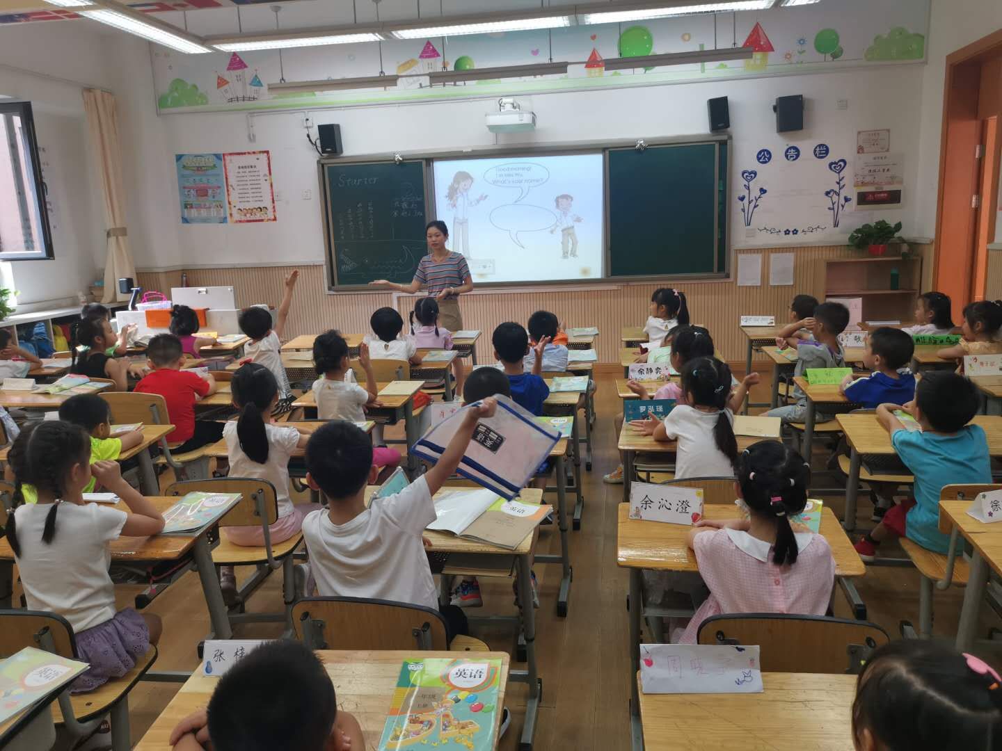 第一节课由王丹老师执教一年级8班,本课是教材Unit 1 Starter。王老师引导小朋友认识本书的主要人物,并通过难度层层递进的游戏帮助小朋友记住他们。接着,王老师带着大家仔细观察情景图,了解场景,预测对话,角色扮演,并通过对比视频进行德育渗透。整堂课环节清晰,王老师亲和力强,耐心又细致,让小朋友感受到了英语学习的乐趣。